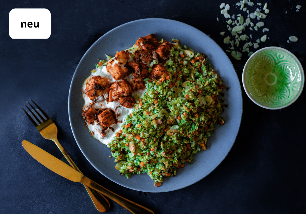 Broccoli and quinoa mix 52% (broccoli, carrots, extra virgin olive oil, cooked quinoa [water, quinoa], almonds, cooking salt, parsley, water, nutmeg), chicken breast 25% (chicken meat, cooking salt), sauce 20% (water, SAHNE, rice starch, cooking salt, lemon juice concentrate), extra virgin olive oil, spices, herbs, cooking salt.